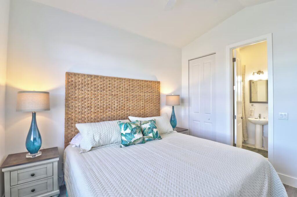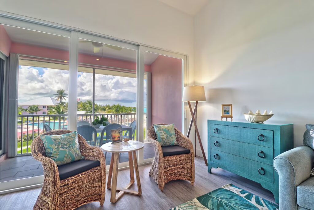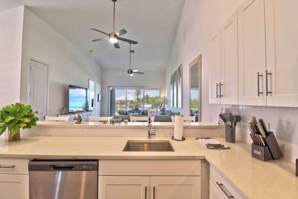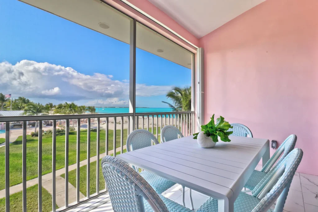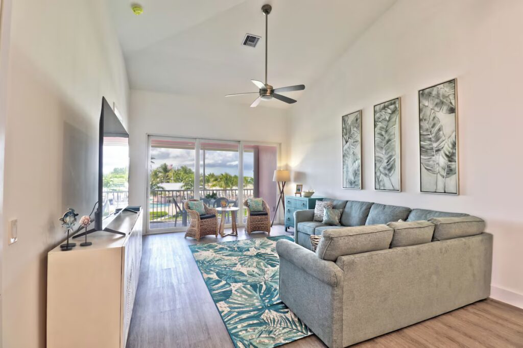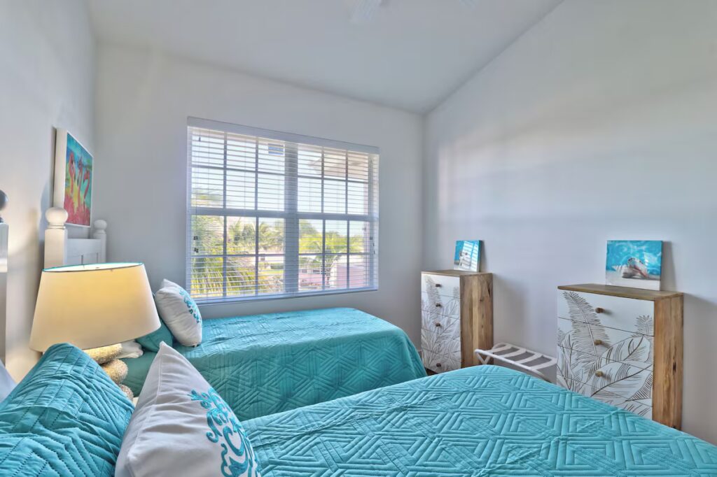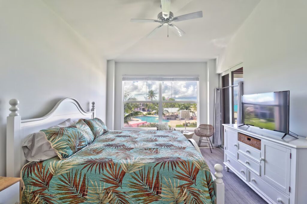 This Treasure Cay condo upstairs unit boasts 3 inviting bedrooms, including 2 king beds and 2 twin beds. Comes with amenities like Wi-Fi, AC, and an iron. The 3 bathrooms are equipped with showers, towels, and hair dryers. Washing machine and dryer included.
